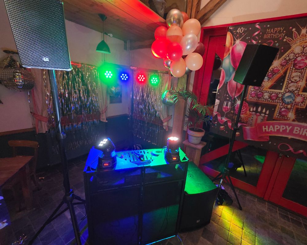 Geen DJ-booth op locatie? Geen probleem, ik neem licht, geluid en show mee!